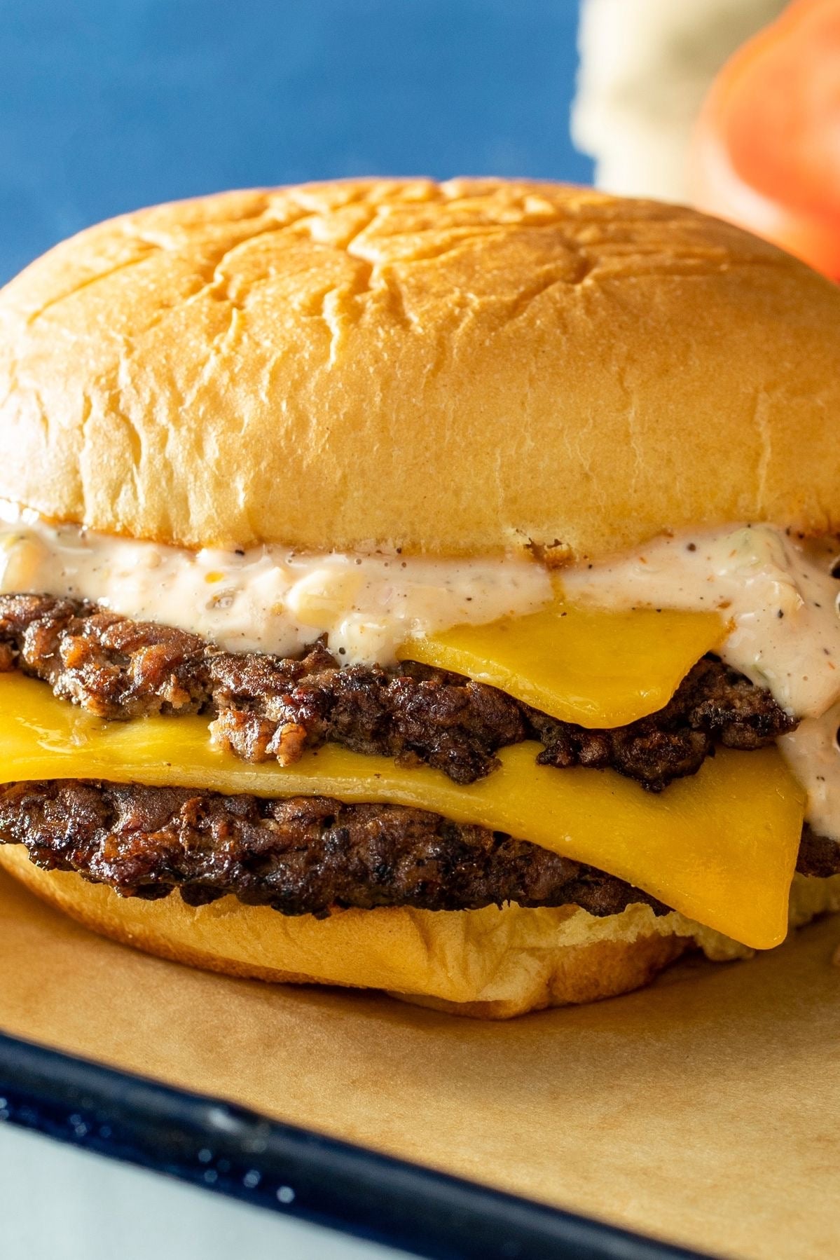 Hamburguesa con doble carne angus, en bollo de pan de papa, cebolla asada, queso derretido y nuestro delicioso aderezo.